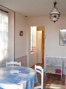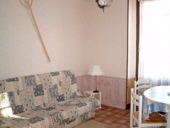 Séjour avec clic-clac, prise TV, cuisine, gazinière,frigo